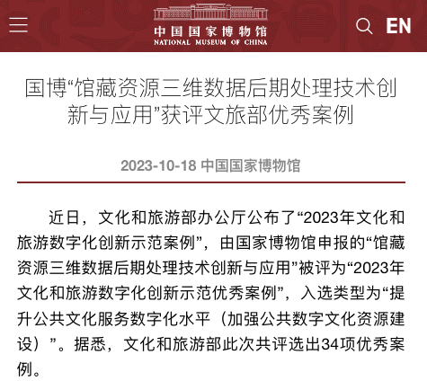 近日,文化和旅游部辦公廳公布了“2023年文化和旅游數(shù)字化創(chuàng)新示范案例”,由國家博物館申報的“館藏資源三維數(shù)據(jù)后期處理技術(shù)創(chuàng)新與應(yīng)用”被評為“2023年文化和旅游數(shù)字化創(chuàng)新示范優(yōu)秀案例”,入選類型為“提升公共文化服務(wù)數(shù)字化水平(加強公共數(shù)字文化資源建設(shè))”。